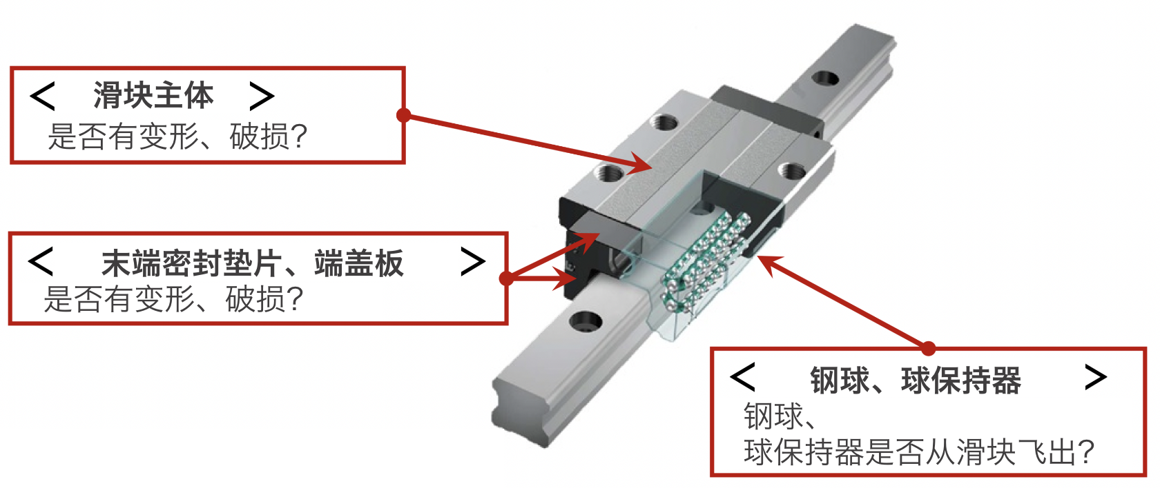 有时会在远处发现脱落的LM滚动导轨钢球。不仅是LM滚动导轨附近,还要在更大范围内检查。