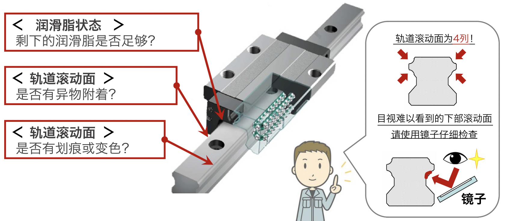目视难以看到的轨道滚动面也要采取一些方法进行检查。