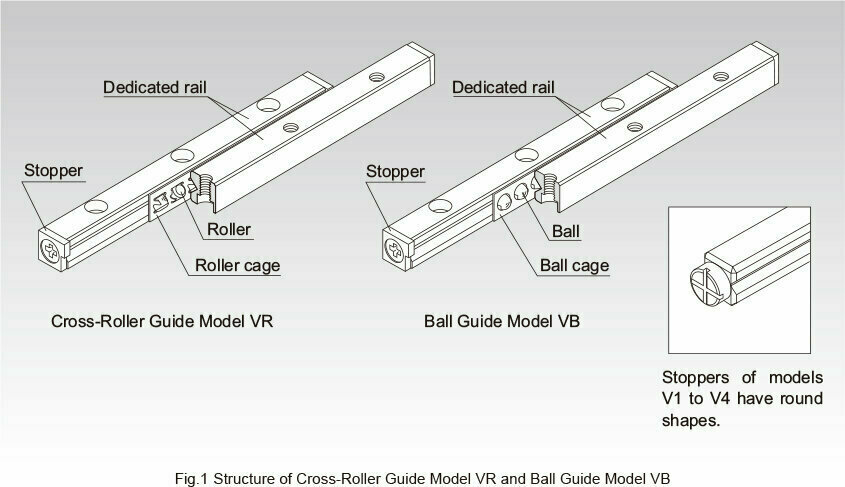 In model VR, precision rollers are orthogonally aligned one after another in a roller cage that is combined with a dedicated rail having a raceway cut into a Vshape groove. When two units of the Cross-Roller Guide are mounted in parallel, the guide system is capable of receiving loads in the four directions. In addition, since the Cross-Roller Guide can be given a preload, a clearance-free, highly rigid and smooth slide mechanism is achieved. Model VB is a low-friction, high-accuracy, finite LM system consisting of precision steel balls, arranged in short pitches in a ball cage model B, and a dedicated rail model V. The Cross-Roller Guide and the Ball Guide are used in the slide unit of various devices such as OA equipment and its peripherals, measuring instruments, precision equipment including a printed circuit board drilling machine, optic measuring machines, optic stages, handling mechanisms and XRay machines.
