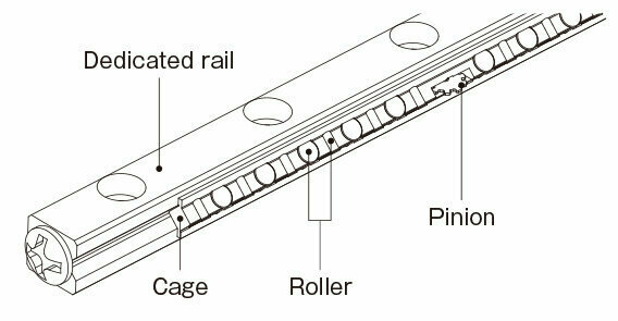 This lightweight, finite stroke linear guide product is composed of precision rollers held in an orthogonal orientation by a cage that is assembled onto a dedicated rail. As a result, it can bear loads in every direction. It also has a high degree of rigidity and, being made of stainless steel, is extremely corrosion- resistant. Additionally, this product achieves accurate motion and maintains cage alignment through the use of a rack and pinion system.
