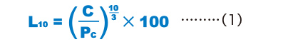 The nominal life of the THK LM roller is defined as 100 km. The nominal life (L10) is calculated from the basic dynamic load rating (C) and the load acting on the LM roller (PC) using the following formula.
