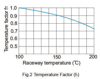If the temperature of the environment surrounding the operating LM Roller exceeds 100℃, take into account the adverse effect of the high temperature and multiply the basic load ratings by the temperature factor indicated in Fig.2 .