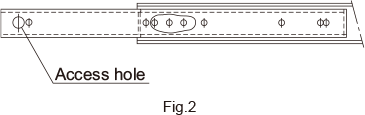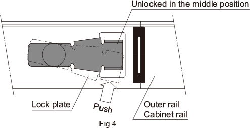 In addition, when mounting the outer rail or cabinet rail of models FBL35G-P13, FBL35G-P14, FBL51H-P13 and FBL56H-P13, which have locking mechanisms, release the lock by pressing the lock plate in the direction indicated in Fig.4 and adjust the position of the access hole.