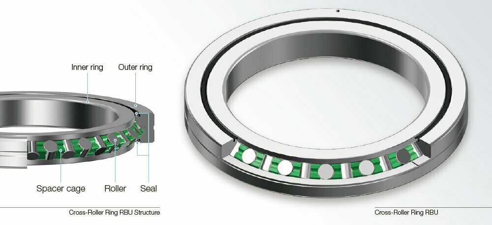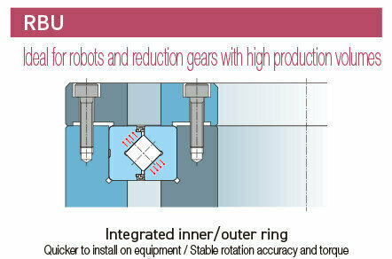 Products with spacer retainers (Model RBU) have a low friction coefficient and demonstrate highly stable rotational torque. Full-Roller products (Model RBUV) are suited to low-speed rotary operations with higher loads, and they are also compatible with all-metal specifications.