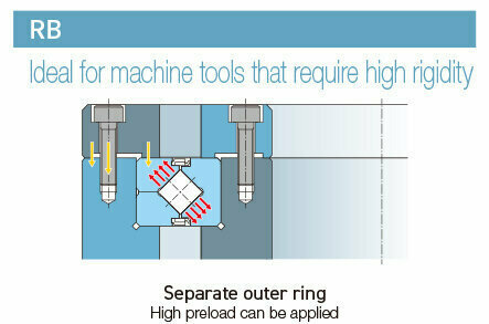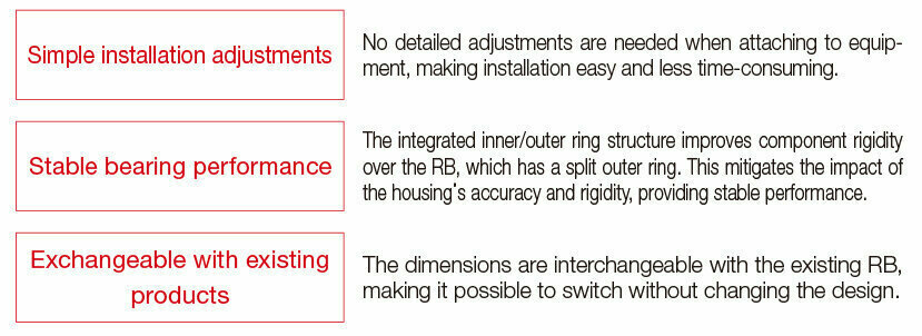 The integrated inner/outer ring structure improves component rigidity over the RB, which has a split outer ring. This mitigates the impact of the housing’s accuracy and rigidity, providing stable performance.