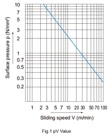 With a sliding bearing, a pV value, which is the product of the contact surface pressure (p) and the sliding speed (V), is used as a measuring stick to judge whether the assumed model can be used. Use the corresponding pV value indicated in Fig.1 as a guide for selecting a spline nut. The pV value also varies according to the lubrication conditions.