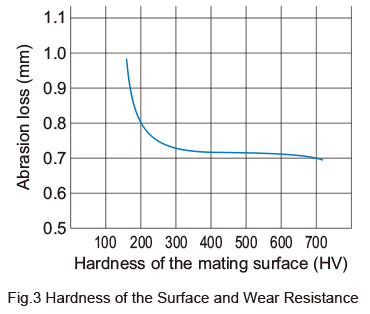 The hardness of the shaft significantly affects the wear resistance of the spline nut. If the hardness is equal to or less than 250 HV, the abrasion loss increases as indicated in Fig.3 .The roughness of the surface should preferably be Ra0.80 or less.