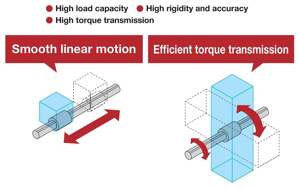 This is a revolutionary product that can also transmit torque while performing linear motion. The permissible load is greater than that of a linear bushing because balls roll in a groove on the shaft.