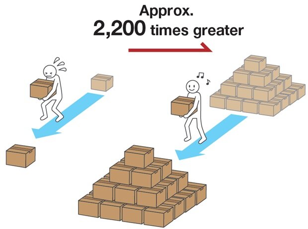 In addition, even when used as an alternative to a linear bushing, the Ball Spline achieves a rated load more than 10 times greater than the linear bushing with the same shaft diameter, allowing it to compactly be designed and used in locations where an overhung load or a moment load is applied. Thus, the Ball Spline provides a high degree of safety factor and long service life.