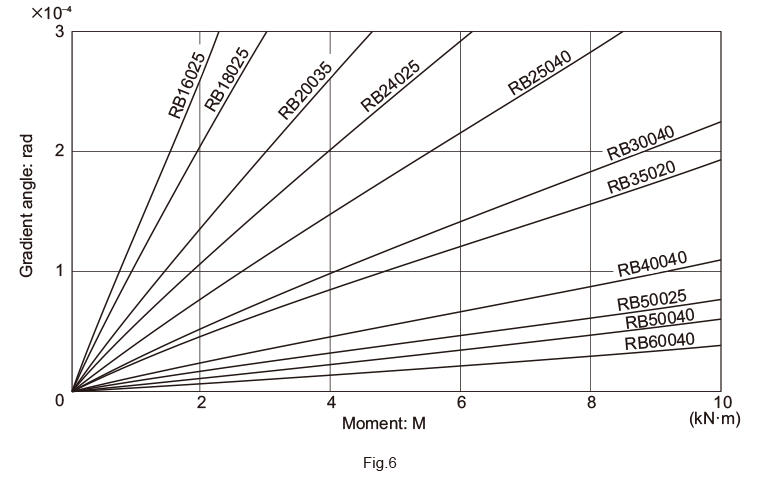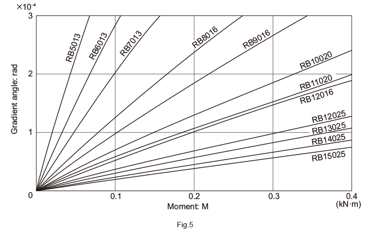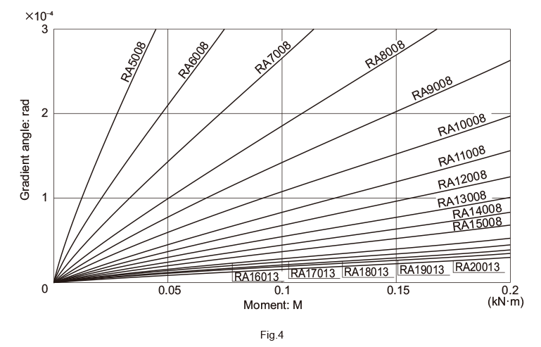 Fig.4 to Fig.7 show moment rigidity diagrams for the Cross-Roller Ring as a separate unit. Rigidity is affected by the deformation of the housing, presser flange and bolts. Therefore, the strength of these parts must be taken into account.