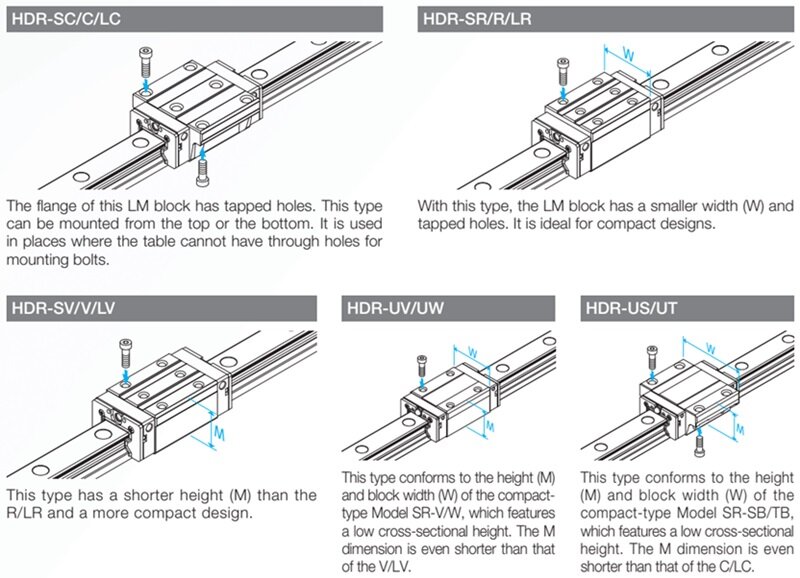 The Model HDR features a lineup of interchangeable LM blocks and LM rails that can be combined freely as long as they have the same model number.