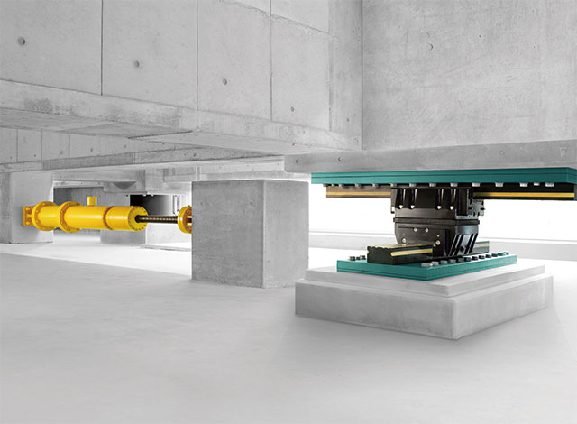 建物全体ではなく、サーバー・精密機器・美術品・物流倉庫の棚など、特定の設備や資産を守る免震システムです。LMガイドを応用した装置を対象物と床の間に設置することで、揺れを効果的に低減。既存の建物にも短期間で導入できるため、データセンターや研究施設などで活用されています。