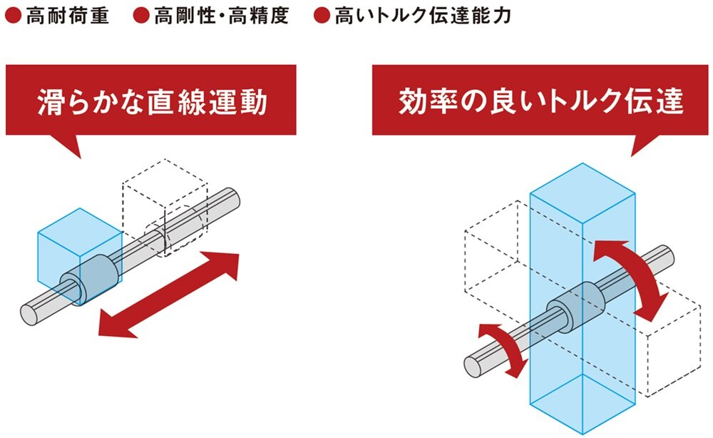 軸に設けられた溝をボールが転がることで許容荷重がリニアブッシュより大きく、直線運動を行いながらトルク伝達もできる画期的な製品です。