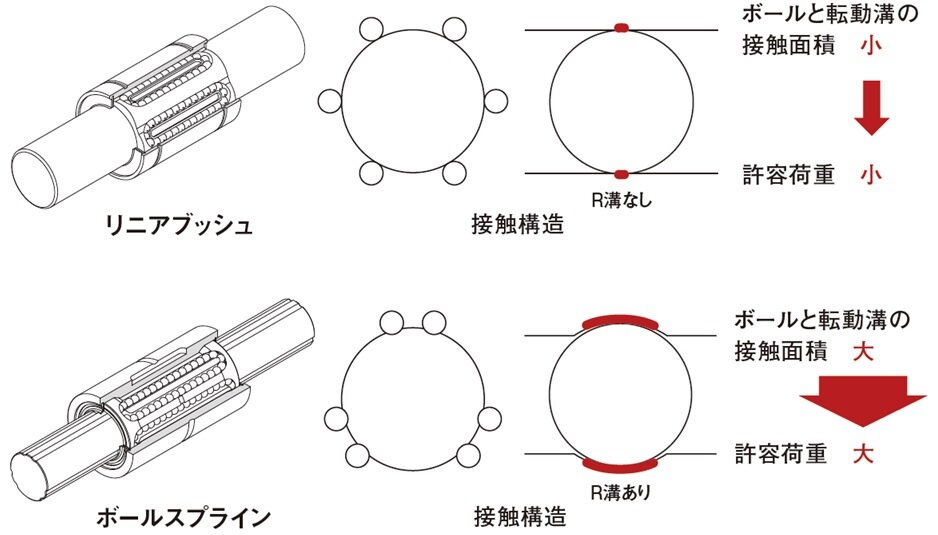リニアブッシュは転がり案内として歴史が古く、今でも幅広く採用されています。リニアブッシュは点接触のため、最小摩擦抵抗で直線運動し、軽快な運動が得られますが、許容荷重が小さいことが課題とされています。ボールスプラインとリニアブッシュの大きな違いは転動溝があることです。転動溝はボールに近似したR溝形状をしているため、点接触に比べ接触している面積が広くなります。