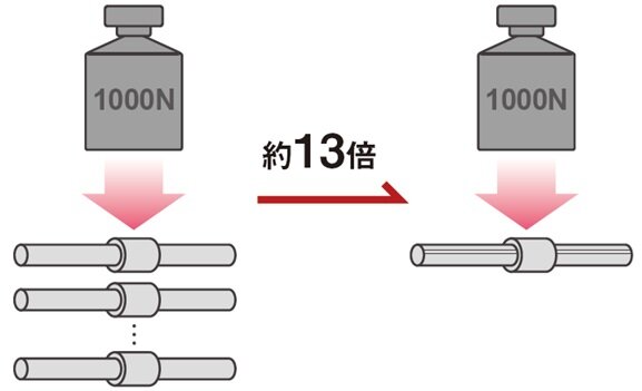 例えば1000Nの荷重を受けるために リニアブッシュだと13本必要なところ、 同じ軸径・ボール径・ボール数の ボールスプラインだと1本で受けることができます。