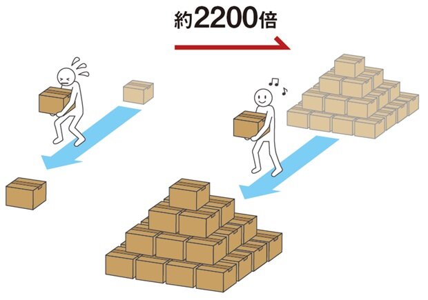 例えば同じ軸径・ボール径・ボール数のリニアブッシュとボールスプラインの場合、リニアブッシュは荷物1個で疲れますが、ボールスプラインは2200個運ぶことが可能になります。