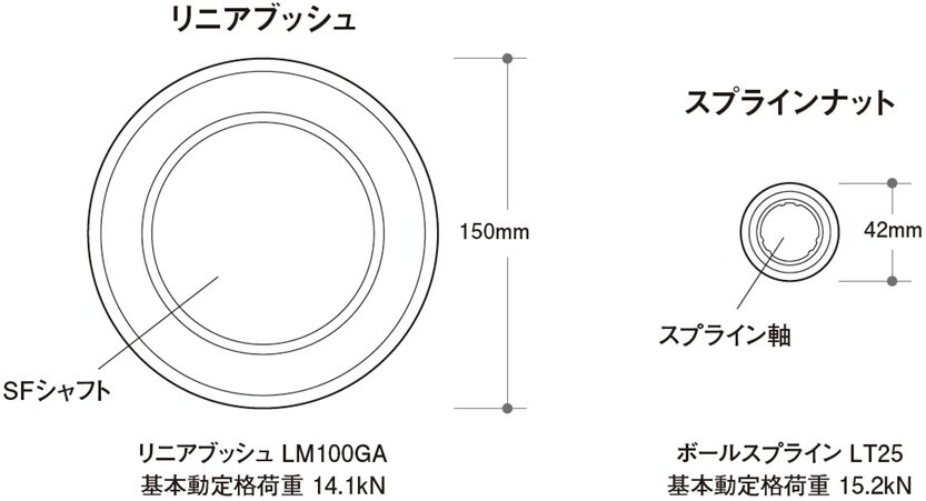さらに従来の構造と異なり、1個のスプラインナットで予圧(プリロード)が与えられるため、振動衝撃荷重が作用する過酷な使用箇所、高精度の位置決め精度が必要な箇所、および高速運動性能が要求される箇所などで高性能を発揮します。