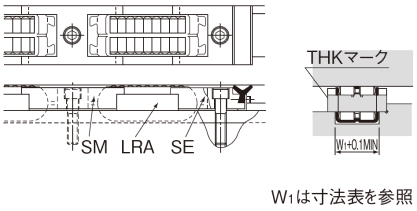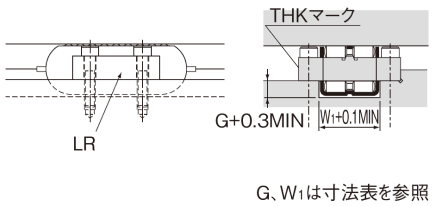 LMローラーの取付例を形番別に示します。進行方向に対するLMローラーの傾きをおさえるために、取付面に基準面を設けて押しあてます。LMローラーの取付基準面は軌道台に刻印されたTHKマークの反対側です。
