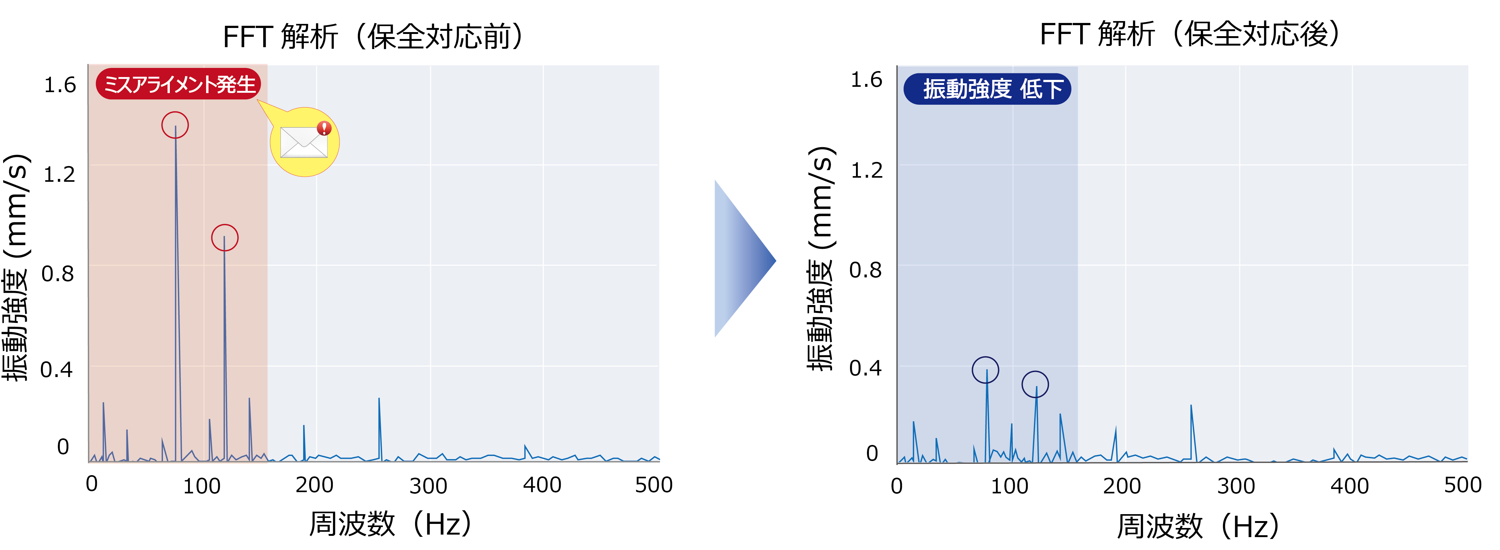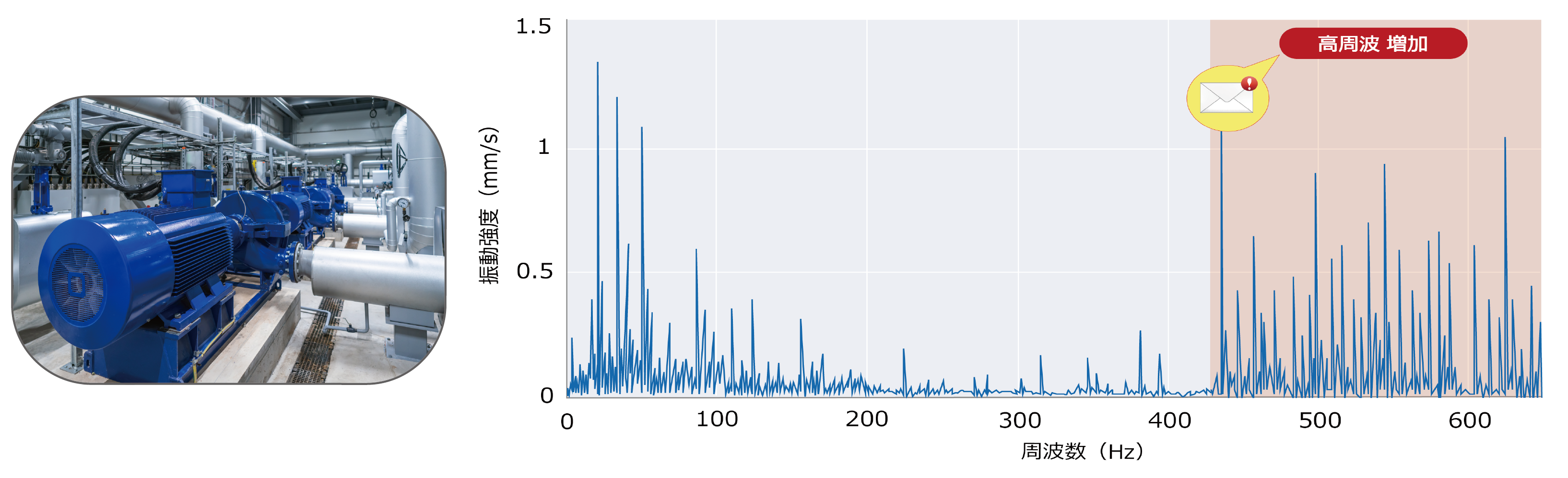 製鉄所内に設置された冷却ポンプに使われているモータにOMNIedgeを導入。稼働データを監視・解析するとモータ振動が増え、特に高周波成分が増加していることが確認されました。システムはこの状態を「ベアリングの初期異常」であると推測し、アラートメールでベアリングの状態を確認するように推奨しました。作業者が確認した結果、すぐに設備が停止するほどの異常ではなかったため、次回の定期メンテナンス時に交換すると判断しつつ、注意深く経過観察することにしました。