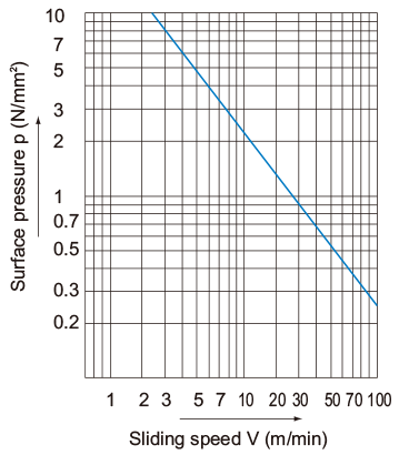 With a sliding bearing, a pV value, which is the product of the contact surface pressure (p) and the sliding speed (V), is used as a measuring stick to judge whether the assumed model can be used. Use the corresponding pV value indicated in Fig.1 as a guide for selecting a change nut. The pV value varies also according to the lubrication conditions.