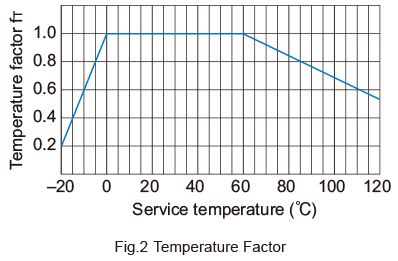 If the temperature of the change nut exceeds the normal temperature range, the seizure resistance of the nut and the strength of the material will decrease. Therefore, it is necessary to multiply the dynamic permissible torque (T) and the dynamic permissible thrust (F) by the corresponding temperature factor indicated in Fig.2 .