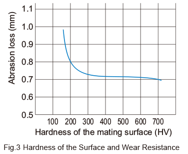 The hardness of the shaft significantly affects the wear resistance of the change nut. If thehardness is equal to or less than 250 HV, the abrasion loss increases as indicated in Fig.3 .The roughness of the surface should preferably be Ra0.80 or less.